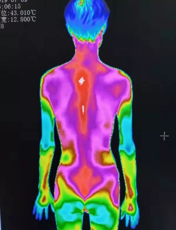 紅外熱成像檢查前準備,檢查前1d內(nèi)避免應用心血管系統(tǒng)藥物、避免吸煙飲酒、避免接受理療,避免局部應用化妝品及膏藥等。去除飾品、護膝、腰圍等影響檢查的物品。檢查前站立并靜息至少15min。檢查室面積3.5m×4.5m,控制溫度(24±1)攝氏度,濕度(55±10)%,密閉門窗,避免空氣對流及陽光直射。檢查時,受檢者背對檢測儀器,對腰背部、臀部、大腿、小腿及足踝部進行掃描檢測。經(jīng)設(shè)備輸出圖像并進行分析,觀察不同受檢區(qū)域顏色并測量各部位溫度的差異,健側(cè)與患側(cè)的體表溫差大于等于0.5攝氏度即可判斷為陽性。